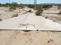 Each of the targets has a manhole with a cement cover and rebar handles. The manhole is located on the west arm of the cross. According to Gary Morgan, member of the Cold War Museum in Warrenton VA., the 6 pieces of rebar, which protrude at an equal distance from each other, may have been used to hold laser lighting to give a more accurate fix on each target.[11]