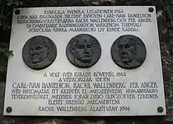 Plaque at the site of the former Swedish Embassy in Budapest, honoring Carl-Ivan Danielsson, Wallenberg and Per Anger