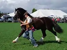 A horse and handler at an outdoor show in the United Kingdom.
