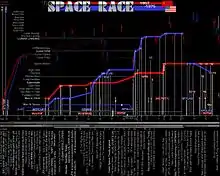 A chart showing relative accomplishments in human spaceflights (along with probes) visually graphing how the U.S. had far surpassed the Soviet Union in the 1970s with lunar missions, yet lagged years behind in space station activity.