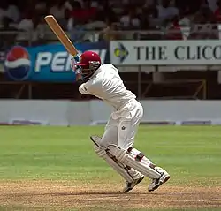Lara scored a Test century for the first time in his fifth Test match in 1993 against Australia.[5] His score of 277 in that match is the fourth-highest maiden century in Test history.[6] The 375 he made against England in 1994 was the highest individual Test score for nine years, until Matthew Hayden surpassed it in 2003.[7] Lara regained the world record in 2004 when he made an unbeaten 400, once again against England.[8] It is also the only quadruple century in Test cricket.[9] The unbeaten 153 he scored against Australia in 1999 was rated as the second-best Test innings of all time by the Wisden Cricketers' Almanack in 2001.[10][11] He has scored more than 200 runs on nine occasions, the highest after Donald Bradman.[12] Alongside Sir Donald Bradman, Virender Sehwag and Chris Gayle, he is one of four batsmen who have scored triple centuries on two occasions.[13] Lara scored 34 centuries during his Test career, the highest number by a West Indian player. He is ranked third for the highest number of centuries in a career along with Sunil Gavaskar and Jacques Kallis, behind Sachin Tendulkar and Ricky Ponting.[14]
