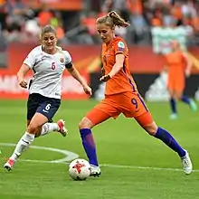 Miedema helped the Dutch qualify for their first-ever FIFA World Cup finals, scoring all three of her side's goals in the two-leg final of the UEFA qualification play-offs against Italy in November 2014.[4] She finished as the top scorer in the qualification campaign with 16 goals.[5] At the finals in Canada, she played all four matches, three group stage games and the round of 16 match, a defeat against Japan. She did not score in Canada.[6] At the 2017 UEFA Women's European Championship, held in the Netherlands, Miedema scored four times, including in the semi-final win over England and in the final against Denmark.[7][8] Her goals helped secure the first ever title for the Dutch women.[8]