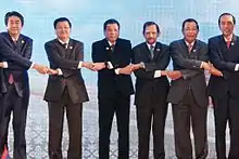 Duterte's first international trip as president was in Vientiane, Laos. He attended the 28th and 29th Association of Southeast Asian Nations (ASEAN) Summits and the Eleventh East Asia Summit.[2] On September 5, after arriving in Vientiane, Duterte met with the Filipino community in Laos. In his remarks, he assured them of his administration's pursuit of a "clean government" that would address crime and corruption, and explained their campaign against illegal drugs.[3] On the sidelines of the summits, Duterte held separate bilateral meetings with six heads of government: Shinzō Abe of Japan,[4] John Key of New Zealand,[5] Lee Hsien Loong of Singapore,[6] Dmitry Medvedev of Russia,[7] Nguyễn Xuân Phúc of Vietnam,[8] and Thongloun Sisoulith of Laos.[9][10] Duterte also paid a courtesy call on Laotian President Bounnhang Vorachith at the Presidential Palace in Vientiane.[11]