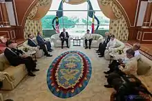 After his visit to Bahrain, the president headed to Doha, Qatar for a state visit to the country. His visit to Qatar is the last leg of his Gulf tour. He arrived at Hamad International Airport in the evening. He was welcomed by Qatar Energy Minister Mohammed Bin Saleh Al Sada upon his arrival at the airport.[104] Duterte on April 15, addressed some businessmen in Qatar and he assured to them that investing in the Philippines, particularly in Mindanao, would be lucrative.[105] Duterte also addressed the Filipino community at the Lusail Sports Arena. At the last day of his visit, he met the Emir of Qatar Tamim bin Hamad Al Thani at the Amiri Diwan. In their meeting, both leaders reviewed means to enhance their bilateral relations in all fields, especially in infrastructure, agriculture, health and education investments and labor. They also discussed "increasing cooperation in the fields of experience exchange and expatriate labor" and "a number of regional and international issues of common interest. After the meeting, Philippine and Qatari officials signed agreements on culture, investment, technical education cooperation, and health. After his visit to the Amiri Diwan, he invited the Emir to visit the Philippines.[106] Duterte's visit to Middle East yielded an amount of investments worth $925 million.[107][108][109][110]