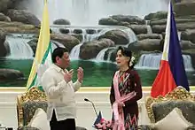 President Duterte traveled to Naypyidaw, Myanmar to embark on an official visit to the country. After his arrival at the Naypyidaw Airport, he headed straight to the Horizon Lake View Hotel to address the Filipino community. In his speech, he criticized the critics of his drug war.[87] He also urged the Filipino community to return to the Philippines to experience that the country is much safer under his administration.[88] During the second day of his visit to Myanmar, he met the President of Myanmar Htin Kyaw. He was accorded arrival honors upon his arrival at the Presidential Palace. In their meeting, both presidents vowed to strengthen bilateral relations between the Philippines and Myanmar.[89] Duterte also expressed his support for Myanmar's effort to seek regional peace. After the meeting, Duterte witnessed the signing of a memorandum of understanding on food security and agricultural cooperation. He also met the State Counsellor of Myanmar Aung San Suu Kyi. In their meeting, Duterte discussed agricultural education and technology with her. After the meeting, Duterte handed over to her a pledge worth of US$300,000 to Suu Kyi for the Philippines' humanitarian assistance to Myanmar's Rakhine State, the biggest donation made so far by an ASEAN member this year. He also met the commander-in-chief of the Tatmadaw Min Aung Hlaing.[90]