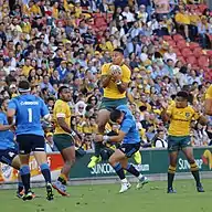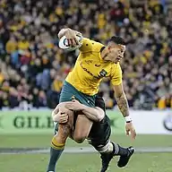 Israel Folau is an Australian international rugby player. Folau plays as a fullback primarily, however, he can, and has, played in other roles such as centre and wing. Folau plays for the New South Wales Waratahs in the Super Rugby.
