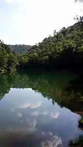 - Mirror Lake, 35°57′54″N 092°10′13″W, el. 427 feet (130 m) [4]