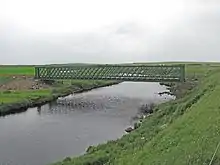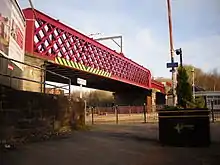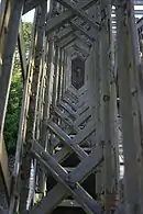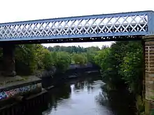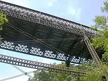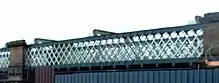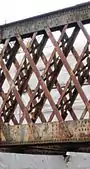 The term "lattice girder", is used in the UK and "lattice truss" is more widely used in the USA. A lattice girder or truss is often defined only in two dimensions, that is (in the case of a bridge) the structure as seen from the side.[1] Such definitions sufficed for the early lattice girders such as the US Town truss which was designed for construction in timber. Early iron structures using a Town-type lattice replicated this appearance, leading to the instantly recognisable lattice-work shown in the bridges in Part A of this list. However, design considerations required that an iron (as opposed to a wooden) structure required many of the latticed bars to be stiffened in the third dimension. Thus, on closer examination, the delicate appearance of these early iron lattices is belied by this much more complex stiffening in the thickness or third dimension. This complex stiffening is itself also sometimes described as a ‘lattice girder’, being composed of (typically) two or four parallel flat or angled steel bars, closely spaced but linked by lattice work. Such a member is better described as a "laced strut", and such members frequently form a significant part of a lattice girder. The use of laced struts within a lattice girder can be seen in the two photographs of the c1860s lattice girder bridge at Llandeilo.