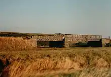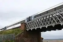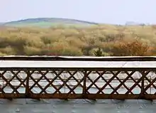 | Montrose Viaduct | 1880 | The end span (see photo) is a conventional Town-type lattice. However, the bulk of this long viaduct consists of longer spans each of which has been strengthened by adding a small degree of upward curvature to the upper horizontals. This makes this structure a unique example of a Town-type bowstring lattice. | ![]() |