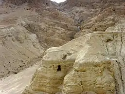 Wadi Qumran Cave 4 was discovered in August 1952, and was excavated from 22–29 September 1952 by Gerald Lankester Harding, Roland de Vaux, and Józef Milik.[1][2] Cave 4 is actually two hand-cut caves (4a and 4b), but since the fragments were mixed, they are labeled as 4Q. Cave 4 is the most famous of Qumran caves both because of its visibility from the Qumran plateau and its productivity. It is visible from the plateau to the south of the Qumran settlement. It is by far the most productive of all Qumran caves, producing ninety percent of the Dead Sea Scrolls and scroll fragments (approx. 15,000 fragments from 500 different texts), including 9–10 copies of Jubilees, along with 21 tefillin and 7 mezuzot.