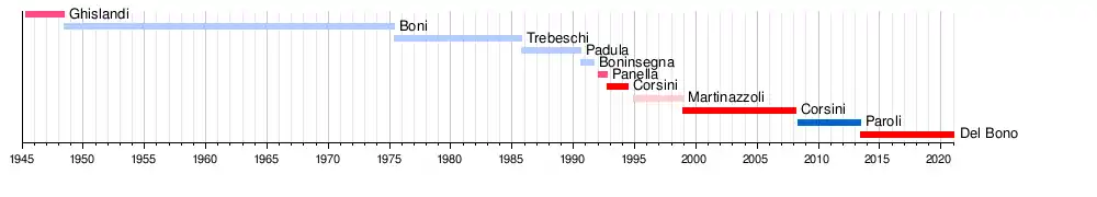 | 2 | Bruno Boni | 16 June 1948 | 15 May 1975 | DC | DC • PSI • PCI (1948–49) DC • PLI • PSDI (1949–65) DC • PSI • PSDI (1965–75) |