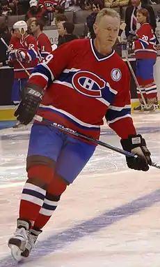 The Player category has been in existence since the beginning of the Hall of Fame and the first nine players were inducted in 1945. For a person to be inducted to the Hockey Hall of Fame as a player, they must have been retired for a minimum of three years and must be nominated by an elected 18-person selection committee.[3] The waiting period was waived for ten players deemed exceptionally notable: Dit Clapper (1947), Maurice Richard (1961), Ted Lindsay (1966), Red Kelly (1969), Terry Sawchuk (1971), Jean Béliveau (1972), Gordie Howe (1972), Bobby Orr (1979), Mario Lemieux (1997) and Wayne Gretzky (1999).[9] Following Wayne Gretzky's retirement, it was announced that the waiting period would no longer be waived for any player except under "certain humanitarian circumstances".[2]
