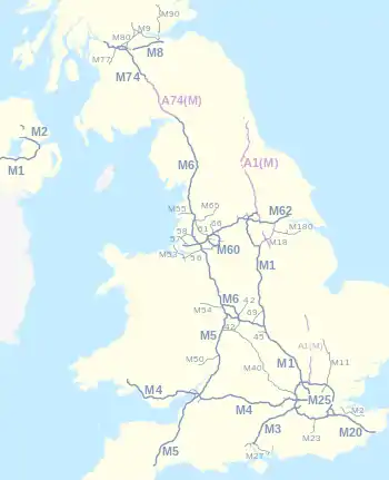 This list of motorways in the United Kingdom is a complete list of motorways in the United Kingdom. Note that the numbering scheme used for Great Britain does not include roads in Northern Ireland, which are allocated numbers on an ad hoc basis.[1]