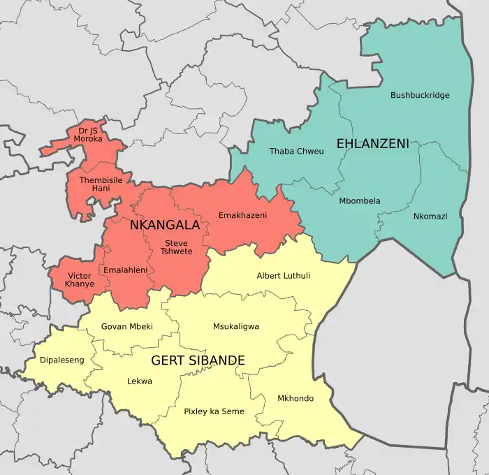 Mpumalanga province of South Africa is divided, for local government purposes, into three district municipalities which are in turn divided into seventeen local municipalities.