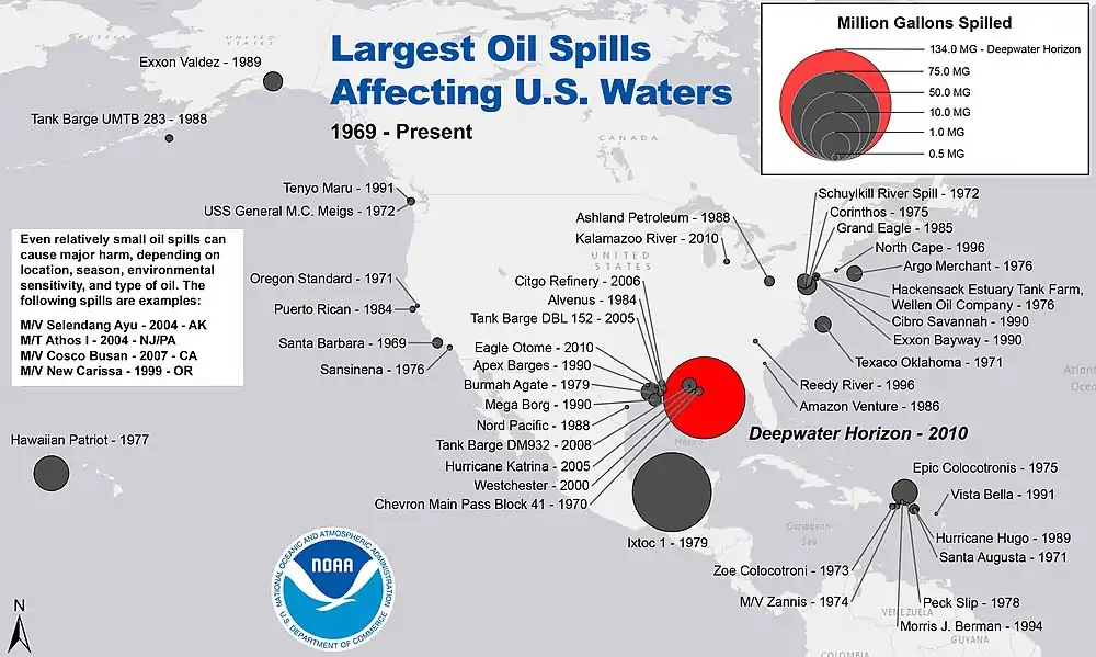 - "Case Study Example for Oil Spill Movement and Fate – Notable oil spills". University of Alabama – College of Engineering. 23 October 2002. Archived from the original on 4 March 2016. Retrieved 15 January 2015.
