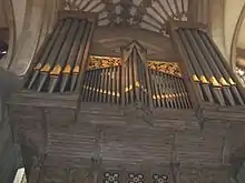 The first record of an organ dates from 1310, with a smaller organ, probably for the Lady Chapel, being installed in 1415. In 1620 a new organ, built by Thomas Dallam, was installed at a cost of £398 1s 5d, however this was destroyed by parliamentary soldiers in 1643 and another new organ was built in 1662,[1] which was enlarged in 1786,[2] and again in 1855.[3] In 1909–1910 a new organ was built by Harrison & Harrison with the best parts of old organ retained,[4] and this has been maintained by the same company since.[5]