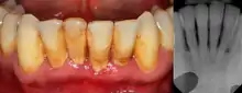 An abscess is a localized collection of pus which forms during an acute infection. The important difference between a periapical abscess and abscesses of the periodontium are that the latter do not arise from pulp necrosis.[10] Abscesses of the periodontium are categorized as gingival abscess, periodontal abscess and pericoronal abscess. Combined periodontic-endodontic lesions may sometimes be abscesses, but these are considered in a separate category. A gingival abscess involves only the gingiva near the marginal gingiva or the interdental papilla. A periodontal abscess involves a greater dimension of the gum tissue, extending apically and adjacent to a periodontal pocket. A pericoronal abscess may occur during an acute episode of pericoronitis in the soft tissue surrounding the crown of a partially or fully erupted tooth, usually around a partially erupted and impacted mandibular third molar (lower wisdom tooth). Periodontal abscesses are the 3rd most common dental emergency,[11] occurring either as acute exacerbation of untreated periodontitis,[11] or as a complication of supportive periodontal therapy. Periodontal abscesses may also arise in the absence of periodontitis, caused by impaction of foreign bodies or root abnormalities.[11]