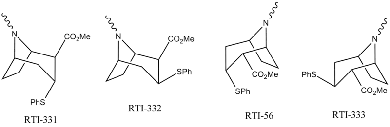 e.g. RTI-55 is in-fact RTI-4229-55 but given below as simply RTI-55 for the sake of simplicity in shorthand (following as is done in the literature itself) as the subject matter in context is wholly within the scope of the phenyltropane coded category herein. Sometimes (more rarely) it is given as RTI-COC-××× for "cocaine derivative."