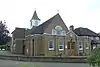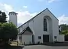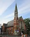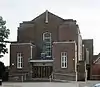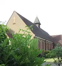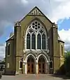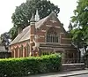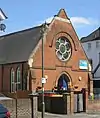 The United Reformed Church was formed in 1972 when the Congregational Church and the Presbyterian Church of England merged. Churches with a Congregational origin exist in Stoke d'Abernon, Thames Ditton and Weybridge, while Walton-on-Thames has a former Presbyterian church. The Thames Ditton church can trace its origins back to 1804, but the present building dates from 1899. The cause declined in the 1930s, and a near-decade long period of closure came to an end in 1947.[46] A Congregational mission was founded at Cobham in 1847 and a permanent chapel was built seven years later,[47] although the present building at Stoke d'Abernon (Cobham United Church, shared with Methodists) dates from 1963.[48] House meetings briefly took place in Weybridge in 1855, and "much interest was excited" by open-air preaching five years later. This led to services being held in the billiard-room of a house, succeeded in 1864 by the present 350-capacity Gothic Revival church[49] (described as "ferocious" by Nikolaus Pevsner).[50] For many years there was also a Congregational church at Hersham serving both the village and nearby Walton-on-Thames: the circular yellow-brick building opened in 1844 and was altered and extended in 1858, 1864 and 1889.[51][52] Around 1907 some members seceded and founded a second church nearby;[52] this continued in use after the 1844 church closed,[note 6] and was replaced by a new building in 1983.[54] This was deregistered in 2008[55] and is now in alternative use. St Andrew's Presbyterian Church in Walton-on-Thames was built in 1931 as a church hall, intended to be superseded by a permanent church; the hall remains in religious use by the United Reformed Church, and ancillary buildings have since been erected. Presbyterians had previously met for worship in a theatre since 1928.[56]