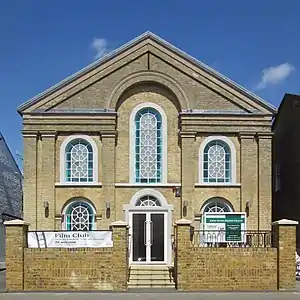 A Baptist fellowship was founded in Esher in 1852[57] and a chapel was built and registered there in 1869.[58] Four years later, members founded a "branch chapel" at Oxshott.[57] A tin tabernacle was erected for Baptists in East Molesey in 1885[59] and replaced with a permanent building the following year,[60] and in 1906 a chapel was registered in Walton-on-Thames.[61] Only the last named has been in continuous use since it opened. Esher Baptist Church (originally called Park Road Chapel) closed in 1977 after a period of decline, but reopened in 1983 under its present name, Esher Green Baptist Church, as a church plant from Walton-on-Thames.[62] The chapel at East Molesey closed in 1896, although a new church replaced it the following year. This closed in the 1930s and was demolished soon afterwards.[60] The registration of Oxshott Baptist Chapel was cancelled in 1980.[63] Also no longer in religious use are the borough's two Strict Baptist chapels: these were built at Claygate in 1860 and at Cobham in 1873.[64] In 1994, a new Baptist church was established in a redundant Anglican church building in Hersham.[65]