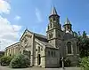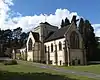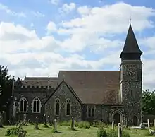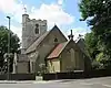 Many of Elmbridge's Anglican churches date from the Victorian era. The ancient church at Weybridge was replaced by a new building on a different site in the churchyard in 1848. St James's Church was designed by John Loughborough Pearson and was extended in 1864.[15][16] Similarly, St Mary's Church at Long Ditton replaced a 12th-century church nearby in 1878.[17] St Mary's Church at East Molesey and St Peter's Church in West Molesey were completely rebuilt in 1864–67 and 1843 respectively; the only older feature surviving at either church is the tower of St Peter's, which is 16th-century.[18][19] Also in the Victorian era, several new Anglican churches were built to cope with the rapid population growth in the area. Holy Trinity Church at Claygate, initially a chapel of ease to Thames Ditton but separately parished within a year, opened in 1840.[12] A year earlier, a church with same dedication was built at Hersham as a chapel of ease to Walton-on-Thames. A parish was formed in 1851, and replacement church (dedicated to St Peter) opened in 1887.[13] Christ Church (1853–54) became the new parish church of Esher, superseding St George's Church.[20] St Paul's Church at East Molesey was built in 1854[18] and was separated from the parish of St Mary's Church two years later.[19] St Mary's Church at Oatlands opened in 1861 as a chapel of ease in Walton-on-Thames parish; it was allocated its own parish eight years later.[13] Anglican services were held in a school in the village of Oxshott[note 1] in Stoke d'Abernon parish during the 19th century.[11] In 1912, a permanent church dedicated to St Andrew was built.[21] Other 20th-century churches opened at Weston Green in 1939,[22] succeeding a mission chapel of 1901,[12] and Hinchley Wood and the southern part of Walton-on-Thames after World War II. A tin tabernacle which was in use by 1911 still serves as a mission chapel in Esher parish;[20] and another mission chapel exists in the hamlet of Downside within the parish of Ockham.[23][note 2] There is also a church at Whiteley Village, a model village designed for retired people and laid out between 1914 and 1921.[24]