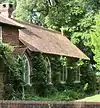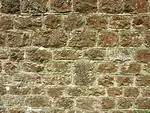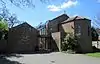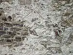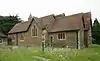 Although "at least two-thirds of Surrey's old churches are faced with flint",[77] stone was much more commonly used in the southwestern parts of Surrey which are now covered by Waverley district.[78] A geological division runs right through Waverley from west to east, entering the county at Hale and continuing along the line of the Hog's Back towards and beyond Guildford. The sandy London Basin to the north yielded almost no usable stone, but to the south the Lower Greensand of the Early Cretaceous period offered much stone for medieval builders to work with.[79] Bargate stone—a coarse, light-brown sandstone—was historically quarried around Chilworth, Guildford and Godalming, and was still being used for new buildings until the late 19th century and beyond.[78] Churches built with it in the medieval period include Alfold,[80] Bramley,[32] Chiddingfold[33] and Dunsfold;[81] and among the 19th- and early-20th-century churches which used it are Busbridge,[82] Grayswood[83] and Hambledon,[84] St Edmund's Catholic Church in Godalming[85] and the Congregational chapels at Elstead (now United Reformed)[86] and Milford (now Baptist).[87] Chalk was quarried extensively in the east and north of Surrey, and some churches use it internally—an example is Alfold.[80] "Irregular veins" of carrstone also occur locally in the Lower Greensand, particularly between Tilford and Albury (near Chilworth).[88] It was used alongside Bargate stone at Cranleigh[29] and Tilford[88] churches among others. Wooden towers and bell-cots are a characteristic feature of Surrey's old churches, but in this part of Surrey only Dunsfold[81] has one—although Hambledon's 19th-century church, designed in keeping with the Surrey vernacular, was given one.[84] Medieval timber porches are more common, occurring at churches including Alfold,[80] Elstead[25] and Thursley.[31] Nonconformist chapels, from the early-18th-century Godalming Friends Meeting House to buildings of the late 19th century, are overwhelmingly brick-built (with stone being used in later chapels),[89] but Hale Methodist Church (1880) is mostly of flint.[59]