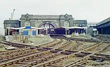 Situated on Admiralty Pier for connection to ships, this was constructed on an expanded pier by SECR, finished in 1914, began to be used on 2 February 1915 but was not available for public use until 18 January 1919; in the meantime it had been renamed Dover Marine on 5 December 1918. It was a large terminus with four platforms covered by a full roof. Platforms were extended to take 12-car trains in February 1959.[6] It was renamed again to Dover Western Docks on 14 May 1979, and was closed by British Rail on 26 September 1994[1] with the demise of boat trains and the opening of the Channel Tunnel. It is now a cruise liner terminal.[7]