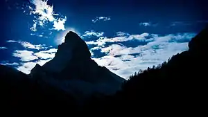 Northeast view of the Matterhorn with the sun highlighting the Furggen and Zmutt ridges, the profile that is mainly used in arts and advertising.[1]