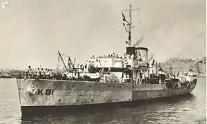 The KJRM was formed in 1920, but it was not until March 1921 that a number of former Austro-Hungarian vessels were transferred, some of which were already obsolete.[1] The only modern seagoing warships transferred were twelve torpedo boats. Little was done to improve the fleet during the 1920s, but fleet modernisation was underway from the early 1930s, with a British-made flotilla leader followed by a class of modern French-designed destroyers and German-built MTBs. Almost all of the fleet was captured by the Axis powers during the April 1941 invasion of Yugoslavia, but a few vessels escaped to form the KJRM-in-exile, which operated under British supervision. Later in the war, several vessels that had been in Italian service were returned to the KJRM-in-exile, and these were joined by a British corvette. At the end of the war, these vessels were transferred to the fledgling Yugoslav Navy.[lower-alpha 1]