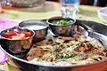 | Paratha | ![]() | A flatbread that originated in the Indian subcontinent in the Pakistani and Indian state of Punjab, paratha is an amalgamation of the words parat and atta, which literally means layers of cooked dough.[47] The paratha dough usually contains ghee or cooking oil which is also layered on the freshly prepared paratha.[48] Parathas are usually stuffed with vegetables such as boiled potatoes (as in aloo ka paratha), leaf vegetables, radishes or cauliflower and/or paneer (South Asian cheese). |