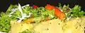 | Papri chaat | ![]() | A Pakistani and North Indian fast food, chaat, an Indo-Aryan word which literally means "lick", is used to describe a range of snacks and fast-food dishes; papri refers to crisp fried dough wafers made from refined white flour and oil. In papri chaat, the papris are served with boiled potatoes, boiled chick peas, chilis, yogurt, and tamarind chutney and topped with chaat masala and sev. |
