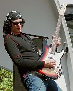 Frehley was replaced by Vinnie Vincent, who first wrote and performed on Creatures of the Night in 1982.[13] The album also featured two songs co-written by Bryan Adams and Jim Vallance.[13] Vincent remained for the 1983 follow-up Lick It Up, although left after the album's touring cycle.[14] He was replaced for Animalize by Mark St. John, which included songs co-written by Desmond Child, Mitch Weissman and Jean Beauvoir.[15] Bruce Kulick debuted on Asylum as the band's fourth lead guitarist, which again included credits for Child and Beauvoir.[16] Crazy Nights and Hot in the Shade featured returning contributors Poncia, Child and Weissman, as well as new additions such as Tommy Thayer, Michael Bolton and Bob Halligan Jr.[17][18] Carr died of cancer on November 24, 1991, with Eric Singer taking over as the band's drummer.[1]