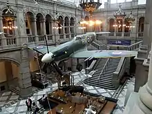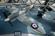 - Spitfire Mk.IIa P7973. This Spitfire was flown on 24 operations by several Royal Air Force (RAF) and Royal Australian Air Force (RAAF) squadrons in 1941. Assigned to No. 452 Sqn (RAAF) (RAF Kenley and RAF Hornchurch), it was flown by a number of pilots, including Australian pilot Keith "Bluey" Truscott on "Circus 68", a bomber escort mission into France on 9 August 1941. This was the mission in which famous legless RAF pilot Douglas Bader was shot down and became a P.O.W. The aircraft has not been repainted since WW2 and bears the markings of the RAF's Central Gunnery School (coded R-H). In July 1945 it was shipped to Melbourne, Victoria, Australia for display. One of the few Spitfires still in its original paint, it has been displayed in the Australian War Memorial in Canberra since 1950.[12]