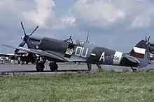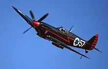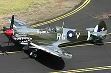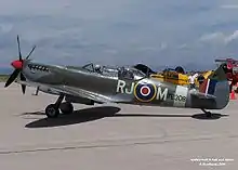- Spitfire LF Mk.XVIe TE392 (VH-RAF). Owned by Fighter Pilot Adventure Flights in Australia. Not much is known about its service with the RAF, but it was a gate guard at a number of RAF airfields, including RAF Kemble and RAF Hereford, between 1952 and 1984. Originally built as a low-back airframe with a 'bubble' canopy, it made its way into civilian ownership and was restored into high-back configuration and flew once again in Florida on Christmas Eve (24 December) 1999 with the FAA register N97RW.[7] It was owned by the Lone Star Flight Museum (LSFM) in Galveston, Texas and was in storage following damage sustained during Hurricane Ike.[8] It wore the markings and colours ZX-Z to represent the personal mount of Sqn Ldr Lance C. Wade No. 145 Squadron RAF, a Texan who flew with the RAF from 1940 to 1944 and went on to become an ace.[9] The FAA tail number was cancelled on 19 December 2018 and was sold to Fighter Pilot Adventure Flights in Australia who restored the aircraft back to its original configuration.[10] It made its first post-restoration flight on 13 January 2020 with the rego VH-XWE (now VH-RAF), and now flies in their 'fly with a spitfire' event once a month.[11]