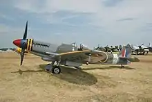 - Spitfire Tr.9 MH367 (ZK-WDQ). Owned by noted aerobatic pilot Doug Brooker and arrived in New Zealand on 11 September 2008. It wears RAF desert colours with the markings of FL-A, a Mk IX EN520 flown by the New Zealand Squadron Leader Colin Gray, C/O of 81 Squadron when based in Tunisia in mid-1943.[76] On 15 January 2009, during a transit flight from Auckland, the Spitfire suffered a heavy forced landing on Hood Aerodrome, near Masterton. The propeller, undercarriage and some fuel lines were damaged but the aircraft was repaired.[77] A second landing accident at Ardmore Airport on 2 December 2009 resulted in damage to the undercarriage and propeller. It is believed that a sudden change in wind direction caused the aircraft to run off the end of the runway.[78] On 12 June 2011 the aircraft suffered yet another landing accident, this time tipping onto its nose after landing at Ardmore, damaging the propeller[79]