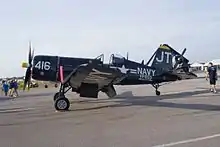 - 133704 – Currently on display at the San Diego Air & Space Museum in San Diego, California.[75] This aircraft was formerly on display at the USS Alabama Museum. It was heavily damaged in Hurricane Katrina. It was taken apart and sent to the San Diego Air and Space Museum in 2008. Over a three-year period, it was restored as an AU-1 in the markings of San Diego Padres long time announcer Jerry Coleman. Coleman flew SBD Dauntless dive bombers during World War II and returned to the Marines to fly the Corsairs in Korea. This aircraft was delivered to the French in May 1953 where it saw service in Algeria and the Suez with the French Aéronavale Flottille 14.