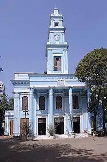 A Baghdadi Synagogue built by David Sassoon in 1861.[5] Following the Victorian style of architecture the synagogue has a high steeple fitted with a clock.[9] The interior of the synagogue is a double-height sanctuary with women's gallery wrapping around three sides of the upper floor. In the 2010s the exterior and interior of the Magen David Synagogue have been painted blue and white.[10] |