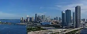The U.S. city of Miami, Florida has the country's third-tallest skyline with over 300 high-rises, 80 of which stand taller than 400 feet (120 m), mainly according to Emporis,[1] SkyscraperPage, and The Skyscraper Center, which is the online database of the Council on Tall Buildings and Urban Habitat. The tallest building in the city is the 85-story Panorama Tower, which rises 868 feet (265 m) in Miami's Brickell district and surpassed all other buildings in height when it topped out in 2017. Nine of the ten tallest buildings in Florida are located in Miami.
