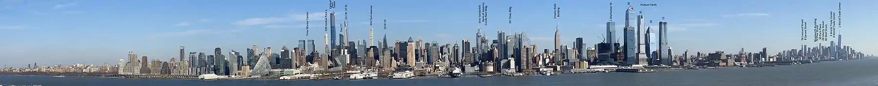 {| class="wikitable sortable" style="text-align:center" |- ! Rank ! Name ! class="unsortable"| Image ! data-sort-type="number"| Height<br />{{small|ft (m)}} ! Floors{{efn-ua|Floor counts often vary among sources, this list uses the number most widely reported in reference. Read the FAQ on the [[Talk:List_of_tallest_buildings_in_New_York_City|talk page]] for details.}} ! Year ! data-sort-type="text"| Address ! data-sort-type="number"| Coordinates ! class="unsortable"| Notes |- | style="word-spacing: -5px;" | _row_count | [[One World Trade Center]] | [[File:One World Trade Center May 2015.jpg|One World Trade Center in the middle, New York City, United States.|200x200px|alt=]] | {{convert|1776|ft|m|0|abbr=values}} | 104<!-- Please don't change to 94 or otherwise invert the number given in the table and footnoted number without discussion on the talk page first, thanks -->{{efn-ua|name=1WTC Floor Count|The building is 104 standard floors tall and most references supply this figure. However, only 94 actual, physically usable, stories are present; see the skyscraper's [[One World Trade Center|main article]] for more details.}} | 2014 | 285 [[Fulton Street (Manhattan)|Fulton Street]] | {{coord|40.713|-74.0135|region:US-NY_type:landmark|format=dms|display=inline|name=One World Trade Center}} | align=left|Also known as the Freedom Tower. Tallest building in the Western Hemisphere by architectural height. Tallest building in New York City and the United States. [[List of tallest buildings in the world|6th-tallest building in the world]]. Roof height is {{convert|1,368|ft|m|0}}, the same as the [[World Trade Center (1973–2001)|original World Trade Center]]. Footprint of the building is {{convert|200|by|200|ft|m|0}}, the same as each of the Twin Towers.<ref name="1WTC sky" /> |- | style="word-spacing: -5px;" | _row_count | [[Central Park Tower]]* | [[File:Central Park Tower April 2020.jpg|267x267px|alt=]] | {{convert|1550|ft|m|0|abbr=values}} | 98 | 2020 | 225 West [[57th Street (Manhattan)|57th Street]] | {{coord|40.7659|-73.98089|region:US-NY_type:landmark|format=dms|display=inline|name=Central Park Tower}} | align=left|Also known as [[Nordstrom]] Tower. At 1,550 feet, it has the highest roof height of any building in the United States, surpassing the [[Willis Tower]] by {{convert|100|ft|m|0}}. The building is also the tallest residential building in the world both by roof height and architectural height. Construction was delayed in 2015 and resumed in 2017.<ref>{{cite news|last1=Solomon|first1=E.B|title=Inside the skyscraper that would be the most expensive residential building ever planned for New York City|url=https://www.businessinsider.com/renderings-of-central-park-tower-2017-7|access-date=June 12, 2020|work=Business Insider|date=July 14, 2017<!-- 10:10 AM -->|archive-url=https://web.archive.org/web/20200612171941/https://www.businessinsider.com/renderings-of-central-park-tower-2017-7|archive-date=June 12, 2020|url-status=live|df=mdy-all}}</ref><ref name="New York YIMBY">{{cite web|url=https://newyorkyimby.com/2015/05/diagrams-show-nordstrom-tower-217-west-57th-street-will-stand-1795-feet-tall-becoming-nycs-tallest-building.html|title=Diagrams Show Nordstrom Tower 217 West 57th Street Will Stand 1,795 Feet Tall, Becoming New York City's Tallest Building|publisher=New York YIMBY|access-date=June 12, 2020|archive-url=https://web.archive.org/web/20200612172040/https://newyorkyimby.com/2015/05/diagrams-show-nordstrom-tower-217-west-57th-street-will-stand-1795-feet-tall-becoming-nycs-tallest-building.html|archive-date=June 12, 2020|url-status=live|df=mdy-all}}</ref> Topped out in September 2019.<ref>{{cite news|url=https://www.newyorkyimby.com/2019/09/central-park-tower-officially-tops-out-1550-feet-above-midtown-becoming-worlds-tallest-residential-building.html|title=Central Park Tower Officially Tops Out 1,550 Feet Above Midtown, Becoming World’s Tallest Residential Building|work=New York YIMBY|last=Young|first=Michael|date=September 17, 2019|access-date=June 12, 2020|archive-url=https://web.archive.org/web/20200612172204/https://www.newyorkyimby.com/2019/09/central-park-tower-officially-tops-out-1550-feet-above-midtown-becoming-worlds-tallest-residential-building.html|archive-date=June 12, 2020|df=mdy-all}}</ref> |- | style="word-spacing: -5px;" | _row_count | [[111 West 57th Street]]* | [[File:SteinwaySep28.jpg|267x267px|alt=]] | {{convert|1428|ft|m|0|abbr=values}} | 84 | 2021 | 111 West [[57th Street (Manhattan)|57th Street]] | {{coord|40.76455|-73.97765|region:US-NY_type:landmark|format=dms|display=inline|name=111 West 57th Street}} | align=left|Also known as [[Steinway Hall|Steinway]] Tower. It is the world's [[slenderness ratio|most slender]] skyscraper.<ref name="CTBUH 111 W 57th St" /><ref name=yahoo163959219>{{cite web|url=https://news.yahoo.com/blogs/future-is-now/tall-and-skinny--the-world-s-skinniest-skyscraper-163959219.html|title=Tall And Slender: The World's Skinniest Skyscraper|url-status=live|access-date=June 12, 2020|archive-url=https://web.archive.org/web/20200612172944/https://news.yahoo.com/blogs/future-is-now/tall-and-skinny--the-world-s-skinniest-skyscraper-163959219.html|archive-date=June 12, 2020|df=mdy-all}}</ref> |- | style="word-spacing: -5px;" | _row_count | [[One Vanderbilt]] | [[File:One_Vanderbilt_42_Street.jpg|267x267px|alt=|]] | {{convert|1401|ft|m|0|abbr=values}} | 59 | 2020 | One [[Vanderbilt Avenue]] | {{Coord|40.7530|-73.9785|region:US-NY_type:landmark|format=dms|display=inline|name=One Vanderbilt}} | align=left|Second tallest completed building in NYC.<ref name="NY1 One Vanderbilt">{{cite web|last=Herzenberg|first=Michael|date=2020-09-14|title=One Vanderbilt, Second-Tallest NYC Office Building, Officially Opens|url=https://www.ny1.com/nyc/all-boroughs/news/2020/09/13/one-vanderbilt--second-tallest-nyc-office-building--officially-opens|access-date=2020-09-14|website=Spectrum News NY1 | New York City}}</ref> It is one of the tallest buildings in Midtown 