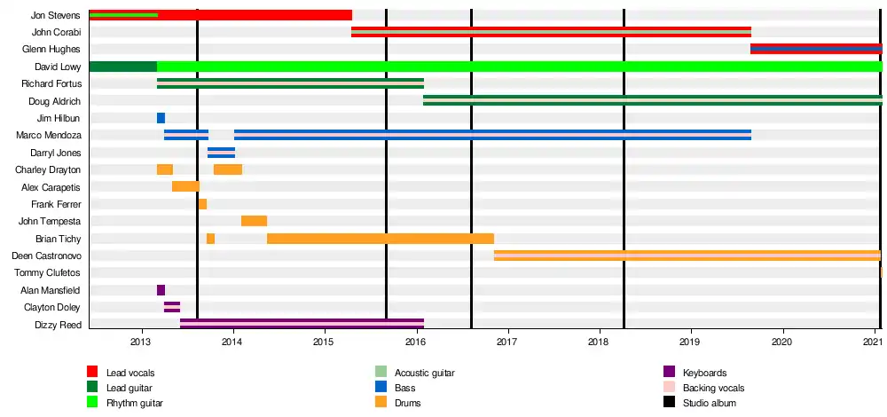 With Hughes as their new frontman, the band issued The Lockdown Sessions EP in July 2020, followed by their fifth album Holy Ground in January 2021.[22] Just two days after its release, it was announced that Castronovo had left due to "medical issues", with Tommy Clufetos returning to take his place on subsequent tour dates.[23]