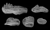 Illustration of a fossilized shell in multiple views of the Silurian monoplacophoran mollusc Tryblidium reticulatum. Head region is to the left.- †Tryblidium rugosum – type locality for species