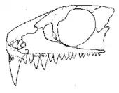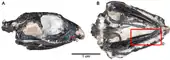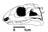 Illustration of a fossilized skull in multiple views of the Permian primitive reptile Acleistorhinus- †Acleistorhinus pteroticus – type locality for species