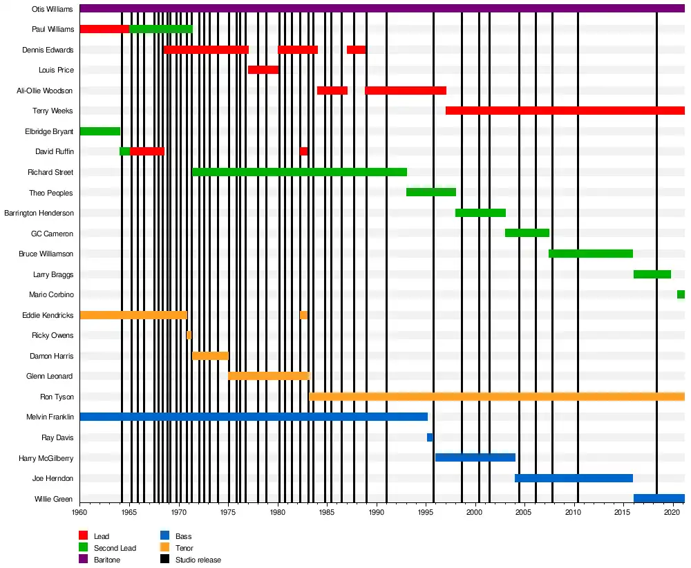 This page is a chronology of the Motown singing group the Temptations. It lists the members of the group during all phases of the group's history. While the Temptations have frequently changed their lineup, the group has always employed a person for each of the following roles: