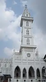 This is the tallest church tower in India and Asia. The 260 feet (79 m) tower stands tall elegantly behind two towers of 140 feet (43 m) height. The red cross on the top of the Bible Tower is lit to show the presence of the Roman Catholic Church in Thrissur. It can be seen from anywhere in the Thrissur city. In the tower one can see the childhood of Christ carved in wood, the healing of Christ depicted in stained glass, the miracles of Christ in brass, the sufferings of Christ in oil paints, beautiful paintings of apostles in terra cotta, mural paintings of the life history of St. Thomas, and the glorious resurrection of Christ depicted in canvas.[2]