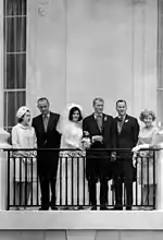 Public weddings in the White House, particularly those of the president's children, "have been feel-good occasions for the country and the commander in chief, casting presidents in the sympathetic role of father."[2] President-elect Richard Nixon encouraged his daughter, Julie, and her fiancé, David Eisenhower, grandson of Dwight D. Eisenhower, to postpone their December 1968 wedding at New York's Marble Collegiate Church and instead have it after his inauguration at the White House, but the couple did not wish for the publicity of a White House wedding.[3] Her older sister, Tricia, is the most recent White House bride to be a child of the president.