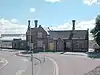 c. 1863 | The listed structure consists of the original station building and the attached stationmaster's house. It is constructed in red sandstone with slate roofs, and is in one and two storeys. Its features include coped Dutch gables with ball finials, casement windows in cream stone surrounds, a glazed porch on a sandstone plinth, and a recessed platform canopy supported by a decorated cast iron column.[7] |
