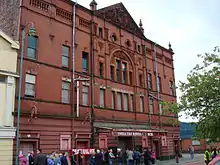 1901–02 | The theatre is in red brick and terracotta with a Welsh slate roof, three storeys and attics. It has a symmetrical front of nine bays, the central bay being wide, with a decorated pediment and an arch with a keystone and decoration in the tympanum in the top floor. There are corner pilasters, bands between the floors, sash windows, two oeil-de-boeuf windows flanked by balustrading in the attic, and finials. Over the doors is a canopy, and in the roof is a lantern.[2][40] | II |