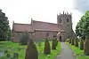 12th century | The lower part of the tower dates from the 13th century and the upper parts from the late 14th century, the porch is dated 1595, the east end of the chancel was rebuilt in 1740, and the church was restored in 1892. It is built in sandstone, with some 12th-century herringbone work, and the roofs are tiled. The church consists of a nave, a north porch, a chancel and a west tower. The tower has three stages, stepped diagonal buttresses, gargoyles at the corners of the belfry, a coved string course, an embattled parapet with moulded coping crocketed pinnacles, and a weathervane.[2][3] | I |