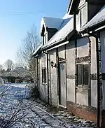 The village of Wrenbury is the only substantial settlement in the civil parish. Many of the listed buildings and structures in the civil parish are located within the conservation area that protects much of its centre and spreads north-west to beyond the canal.[5] Five cluster around the village green and the adjacent parish church dedicated to St Margaret, the third grade-II*-listed structure. The church dates from the early 16th century and is the oldest listed structure in the civil parish. The four half-timbered "black and white" cottages to have listed status all date from the 17th century; this century accounts for half of the timber-framed buildings in Cheshire.[6] The earliest are believed to be Elm House on the village green and a small cottage within the churchyard, thought to be a former almshouse and a schoolmaster's house associated with the free school founded in 1605, also located in the churchyard.[7][8] Later listed buildings are built in brick, a reflection of the shift in domestic architecture from timber framing to brick construction, also observed in unlisted buildings. The most recent listed building is the village primary school of 1879, which is typical of the local schools built after the Education Act of 1870.[9]