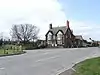 1837 A school and schoolmaster's house in red brick, later used for other purposes. The school has a moulded stone eaves cornice, a slate roof with moulded stone-coped gable ends, and one storey. To the right is a projecting stone gabled porch with a finial and a datestone in the form of a shield. The windows are modern replacements. The house to the left has a tile roof, two storeys, an L-shaped plan, a gabled porch with a Tudor arch, and casement windows with stone surrounds and diamond glazing.[9][56] II